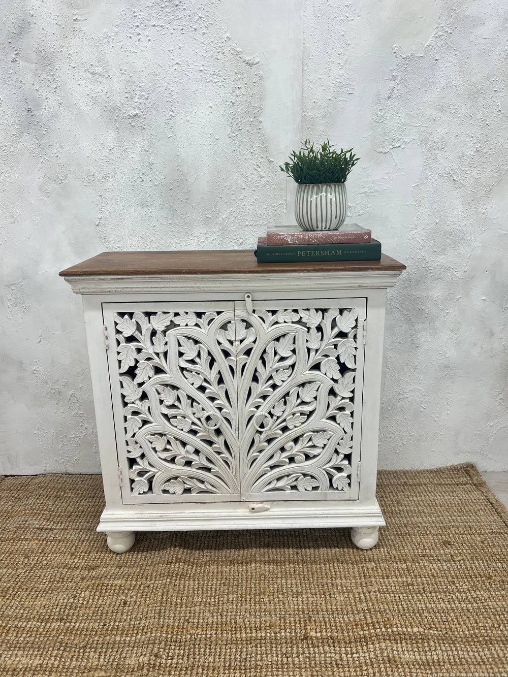 - Whitewashed Finish: Featuring a whitewashed exterior with a contrasting dark polished top, offering a contemporary yet rustic look that complements modern interiors.