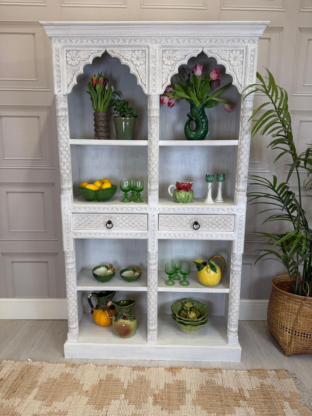 Hand-Carved Mango Wood Bookcase – Whitewashed Finish with Four Arched Display Shelves