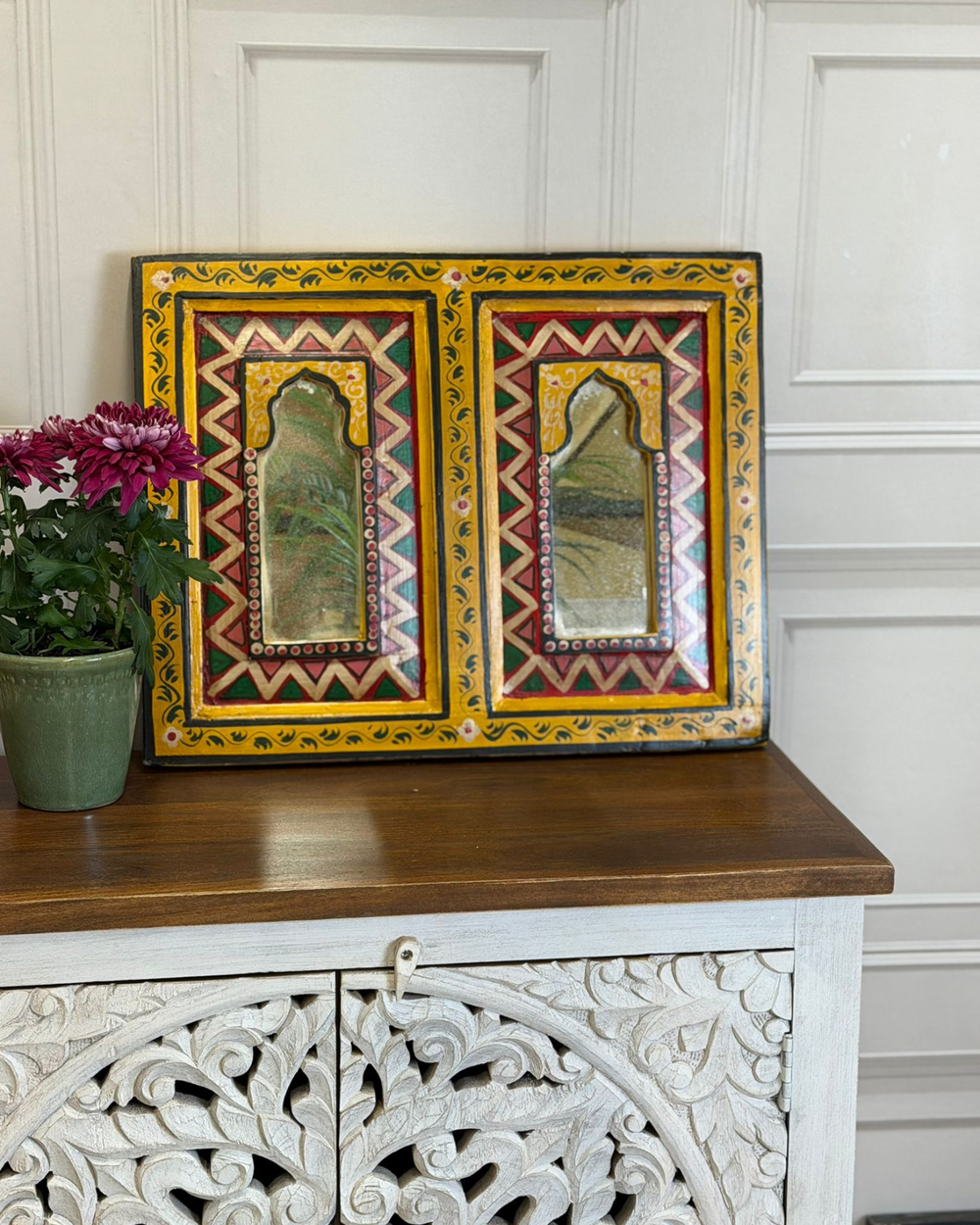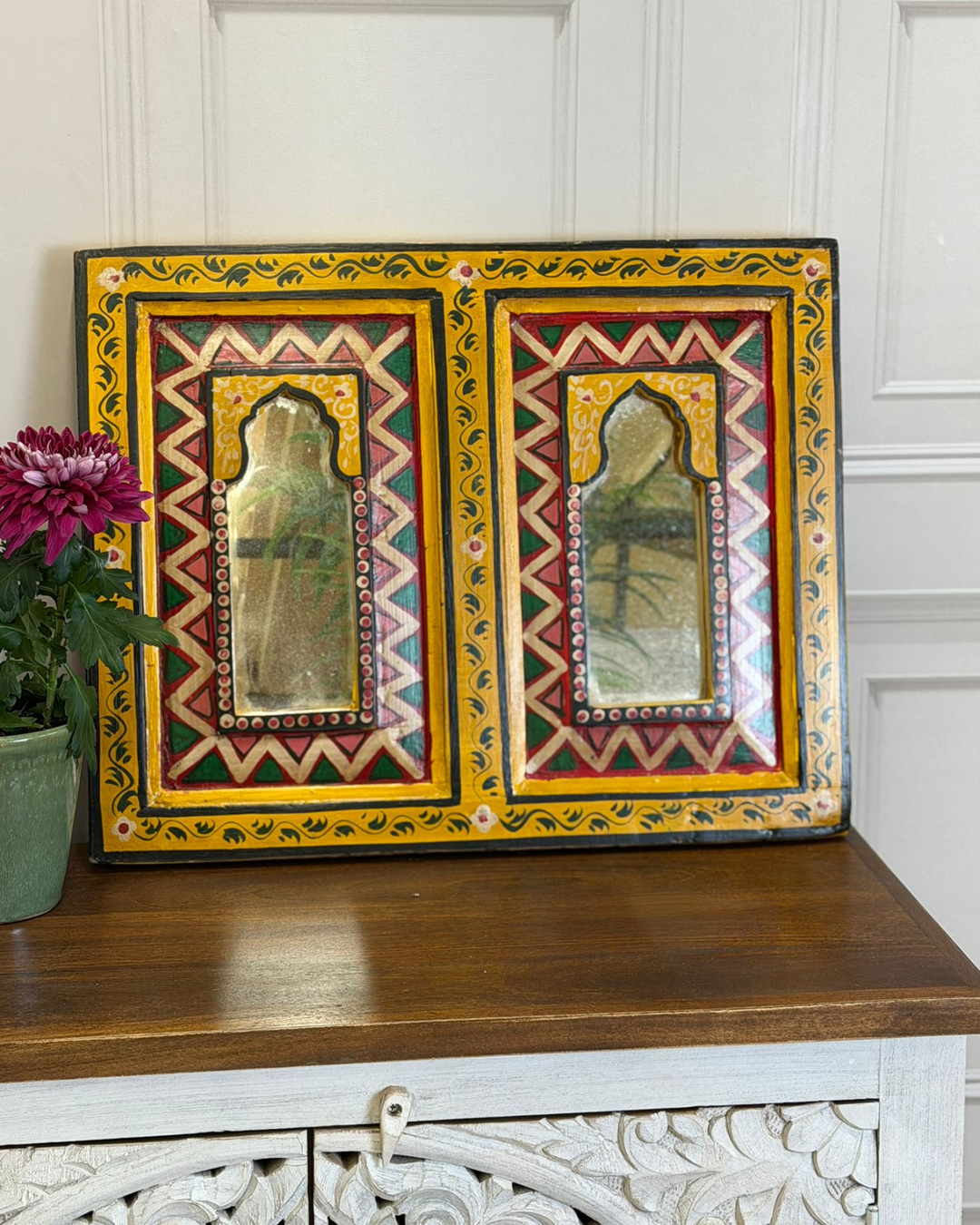 Hand-Painted Vintage Mango Wood Double Mirror Panel – Arched Multicolour Design (54 x 36 cm)
