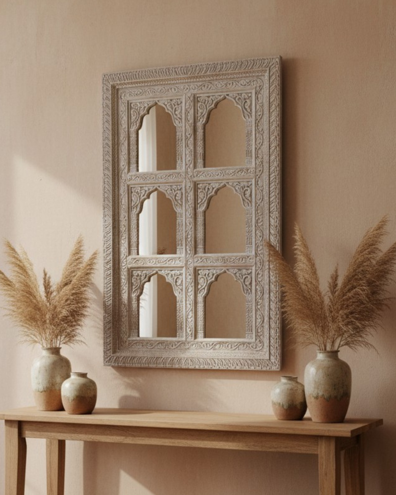 This mirror is perfect for homeowners seeking a statement décor piece that balances beauty and function. The six-panel design evokes the charm of traditional Indian windows while providing a generous reflective surface to brighten the home. Its creamwashed tones pair effortlessly with natural woods, earthy palettes and soft textiles, creating a warm, serene atmosphere in any room.