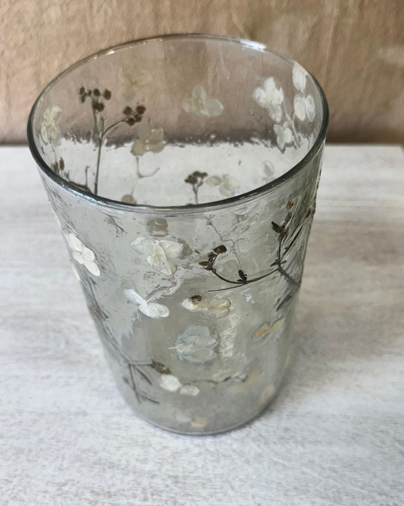 This exquisite hand-blown vase is crafted from recycled glass and adorned with delicately pressed flower petals, creating a naturally patterned finish that celebrates the beauty of imperfection. No two pieces are ever the same, thanks to the artisanal process that embeds real botanical elements into the molten glass. The result is a soft, organic texture that catches the light beautifully, adding subtle charm and depth to any space.