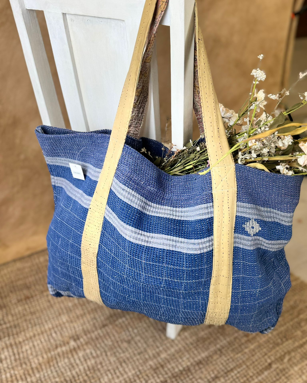 Handmade Upcycled Sari Tote Bag – Indigo Blue Stripe | Multi-Purpose Everyday & Beach Bag