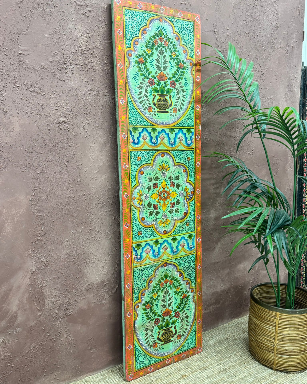Hand-Painted Vintage Indian Door – Reclaimed Floral Panel in Turquoise & Green