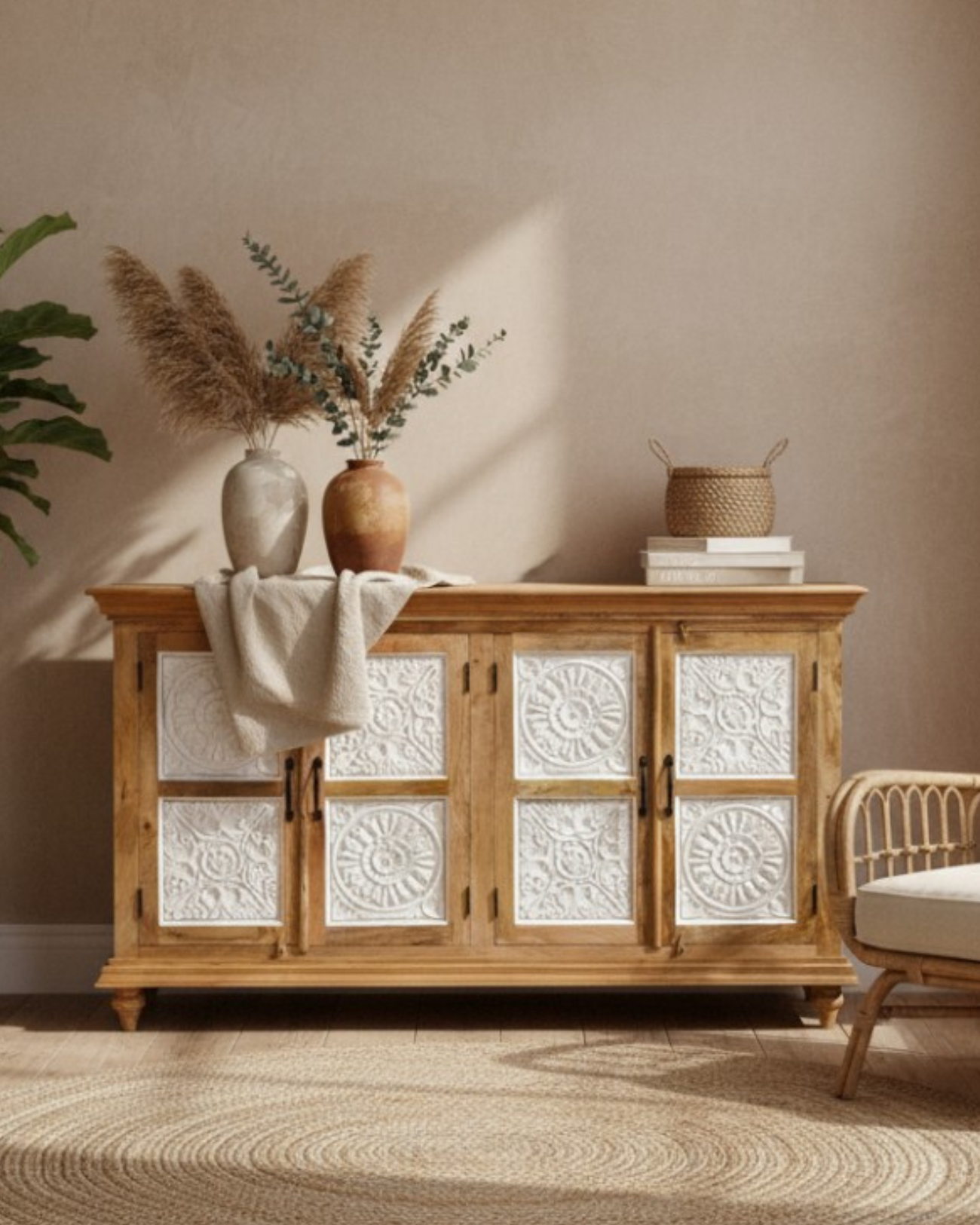 This exquisite hand-carved mango wood sideboard embodies the perfect balance of artistry and functionality. Crafted by skilled artisans, each panel features intricate whitewashed floral motifs, inspired by traditional Indian woodcarving techniques passed down through generations.