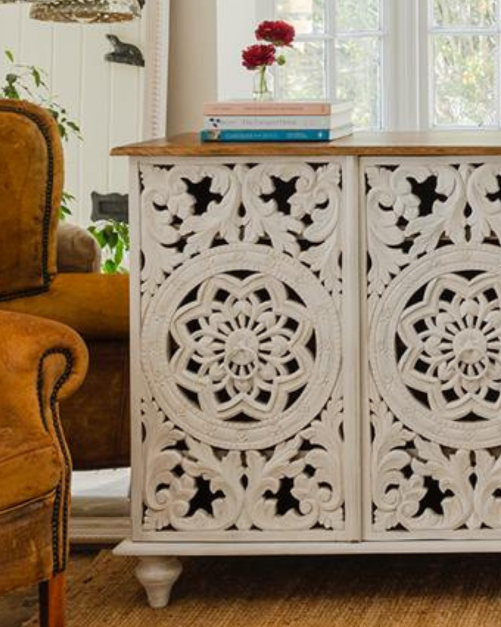 Hand-Carved Whitewashed Four Door Mango Wood Sideboard – Open Floral Design