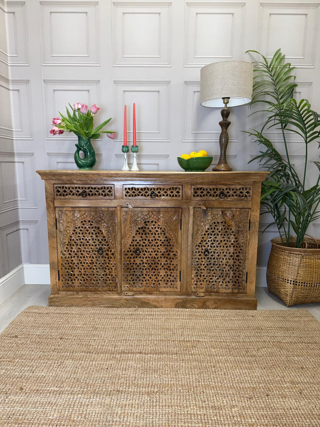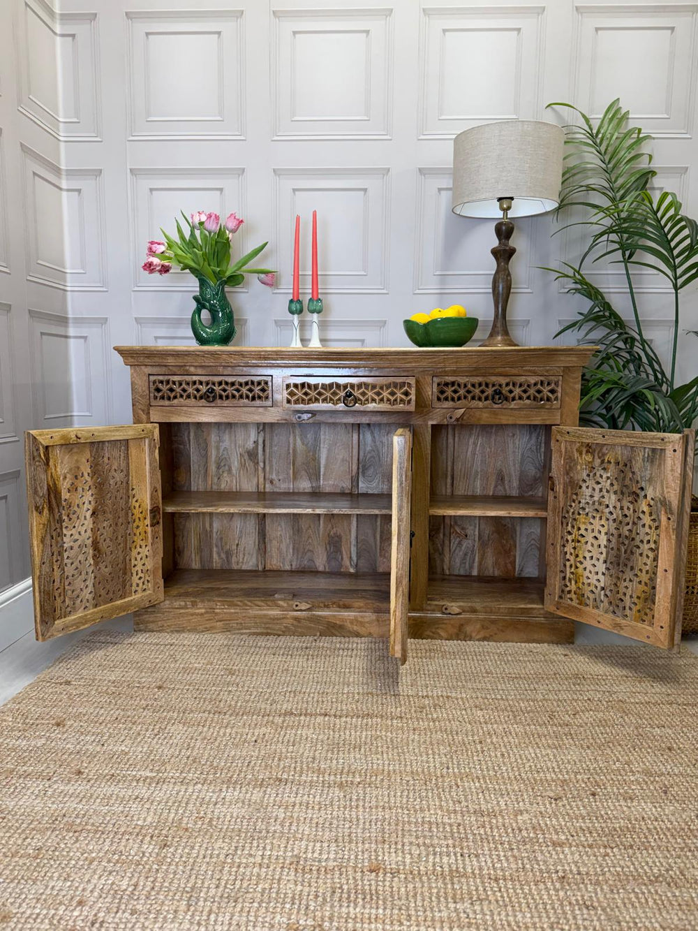 Three Door Three Drawer Mango Wood Sideboard – Creamwashed Jali Design