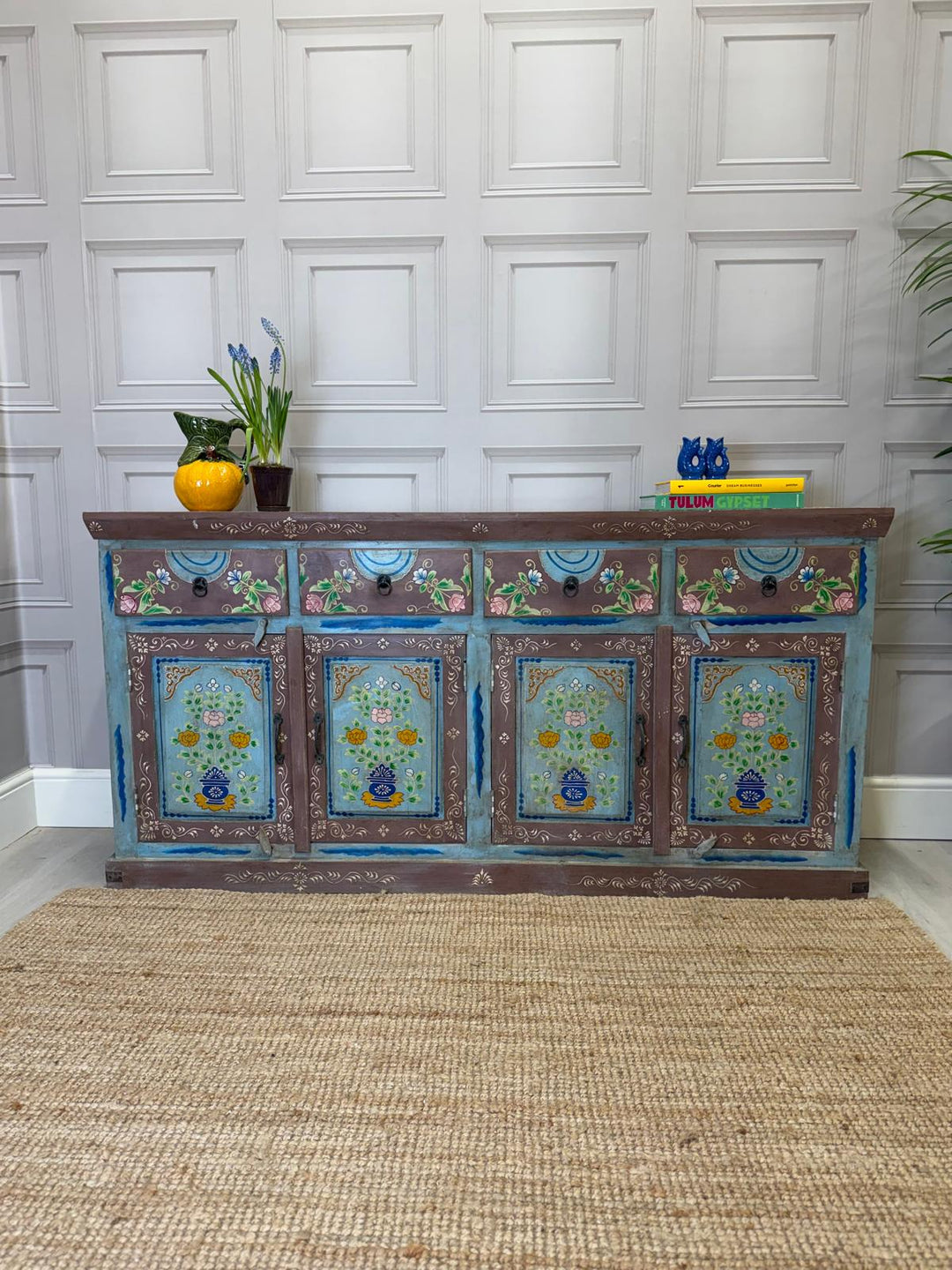 Hand-Painted Mango Wood Sideboard – 4 Doors & 4 Drawers, Floral Design (180cm)