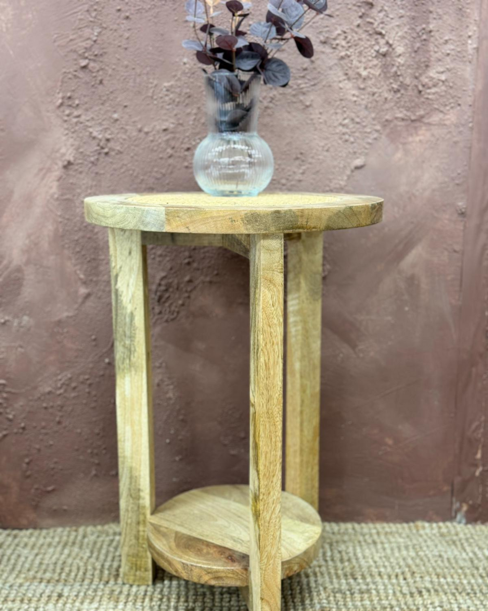 This charming small round side table is expertly crafted from sustainable mango wood. The natural beauty of the wood shines through, offering a warm and inviting aesthetic. It features a unique rattan inlay on the top, adding a touch of elegance and texture to its design.