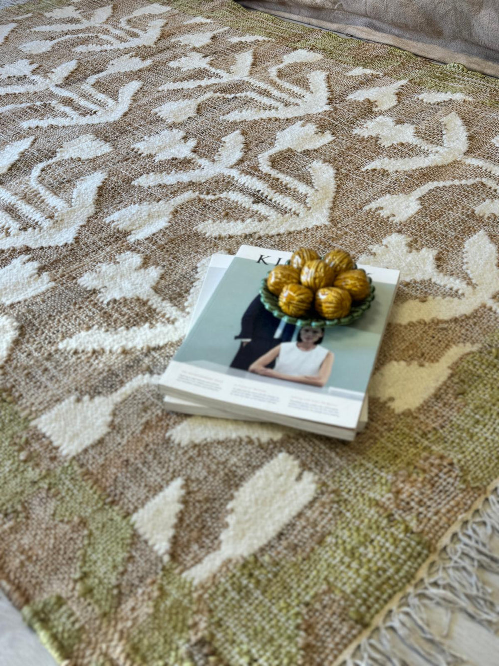 Jute & Hand-Carded Wool Handwoven Rug – Natural with Soft Green Border (120 x 180cm)