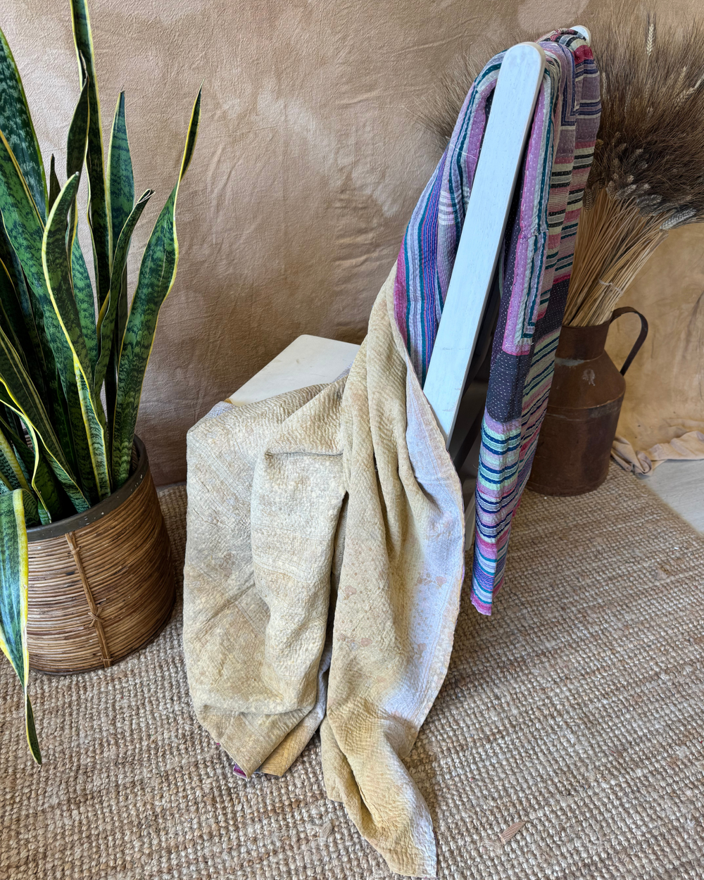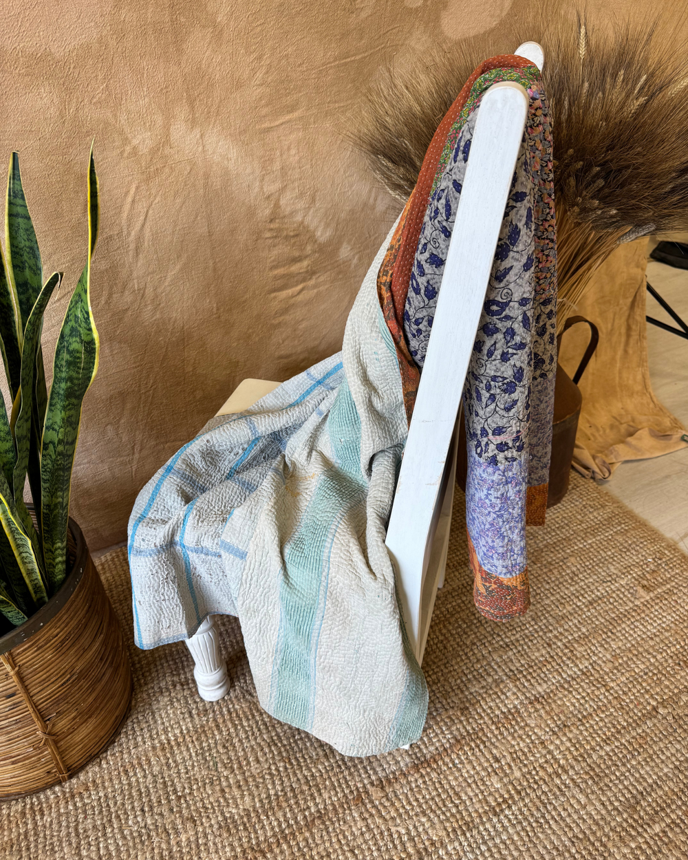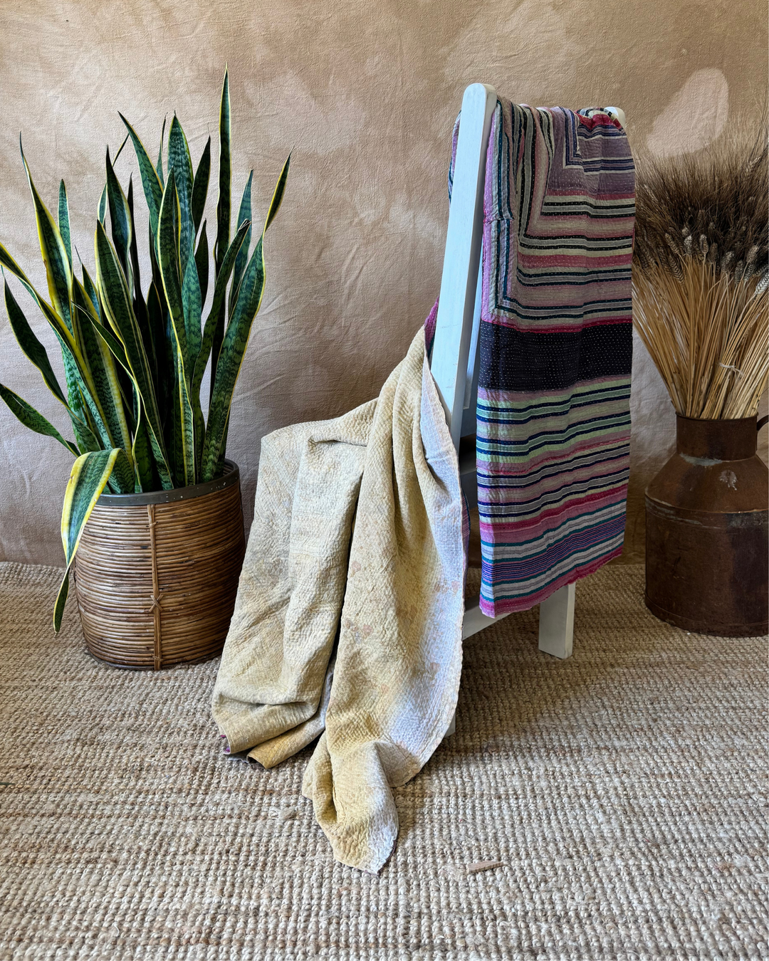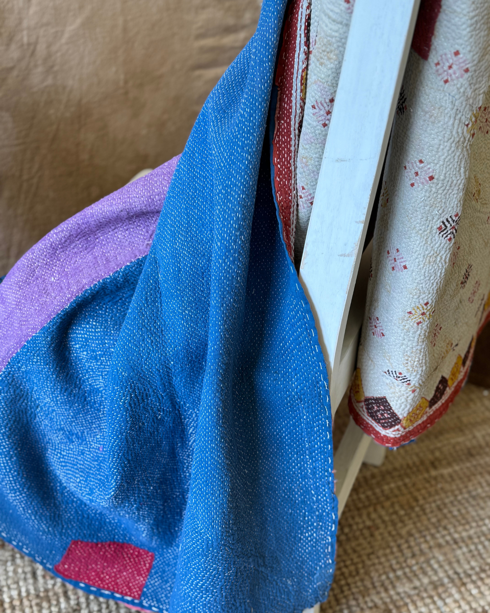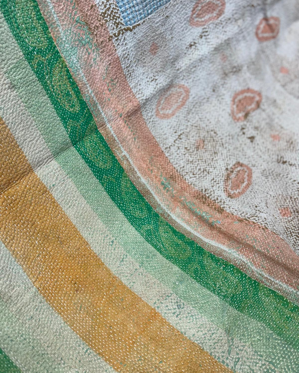 Sourced from vintage saris once worn by women across India, each textile carries its own quiet story – of colour, tradition, and renewal. The intricate running stitches not only bind the fabric but bring new life to it, creating richly layered pieces full of texture, character, and cultural depth.