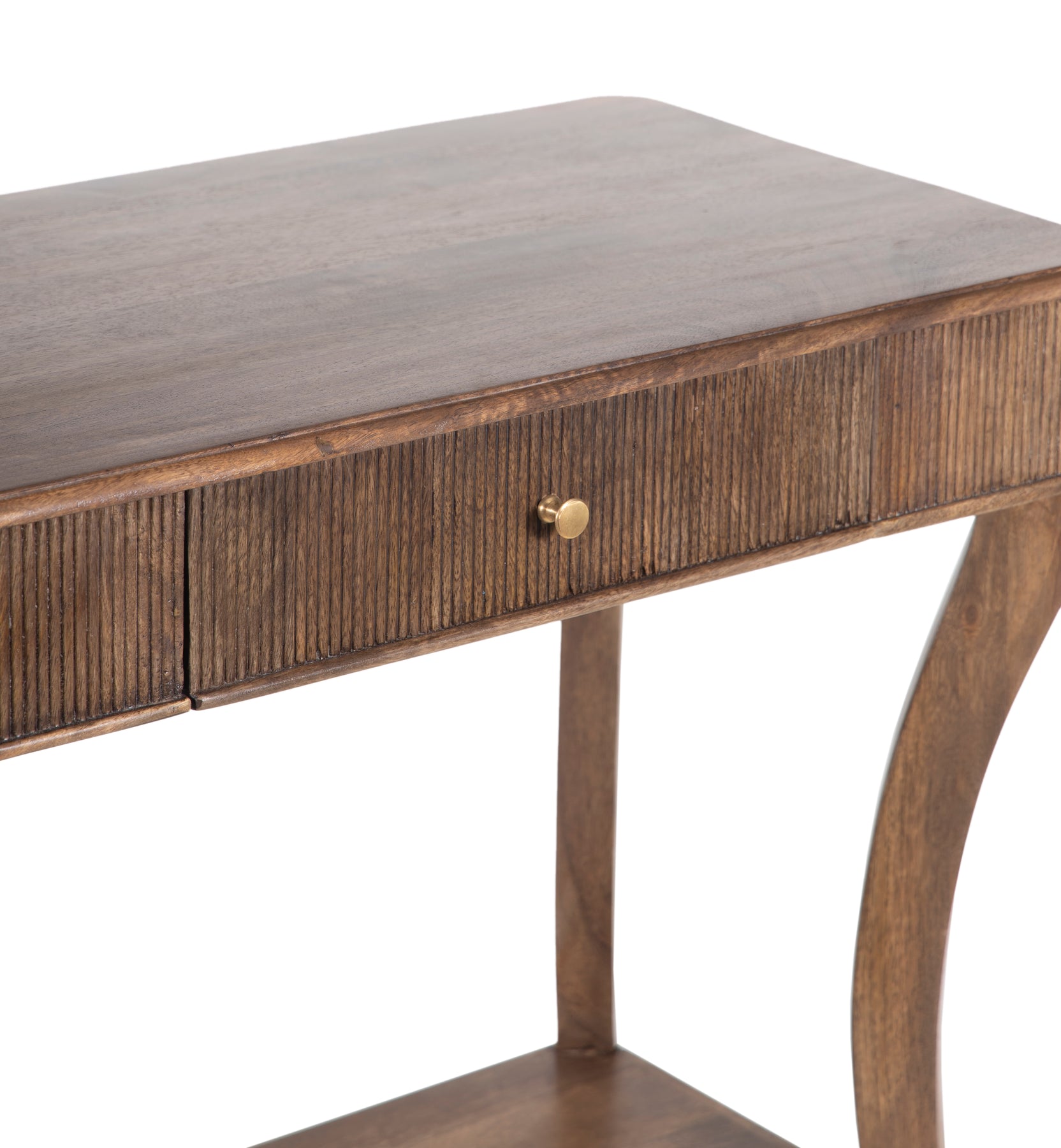 The front drawer is finished with finely carved vertical linear detailing, introducing texture and subtle depth without overwhelming the piece. Elegantly bowed legs bring movement and lightness to the silhouette, while the lower shelf provides a practical surface for books, baskets, or decorative objects. Balanced and understated, this console table brings craftsmanship and function together in a form that feels timeless and versatile.