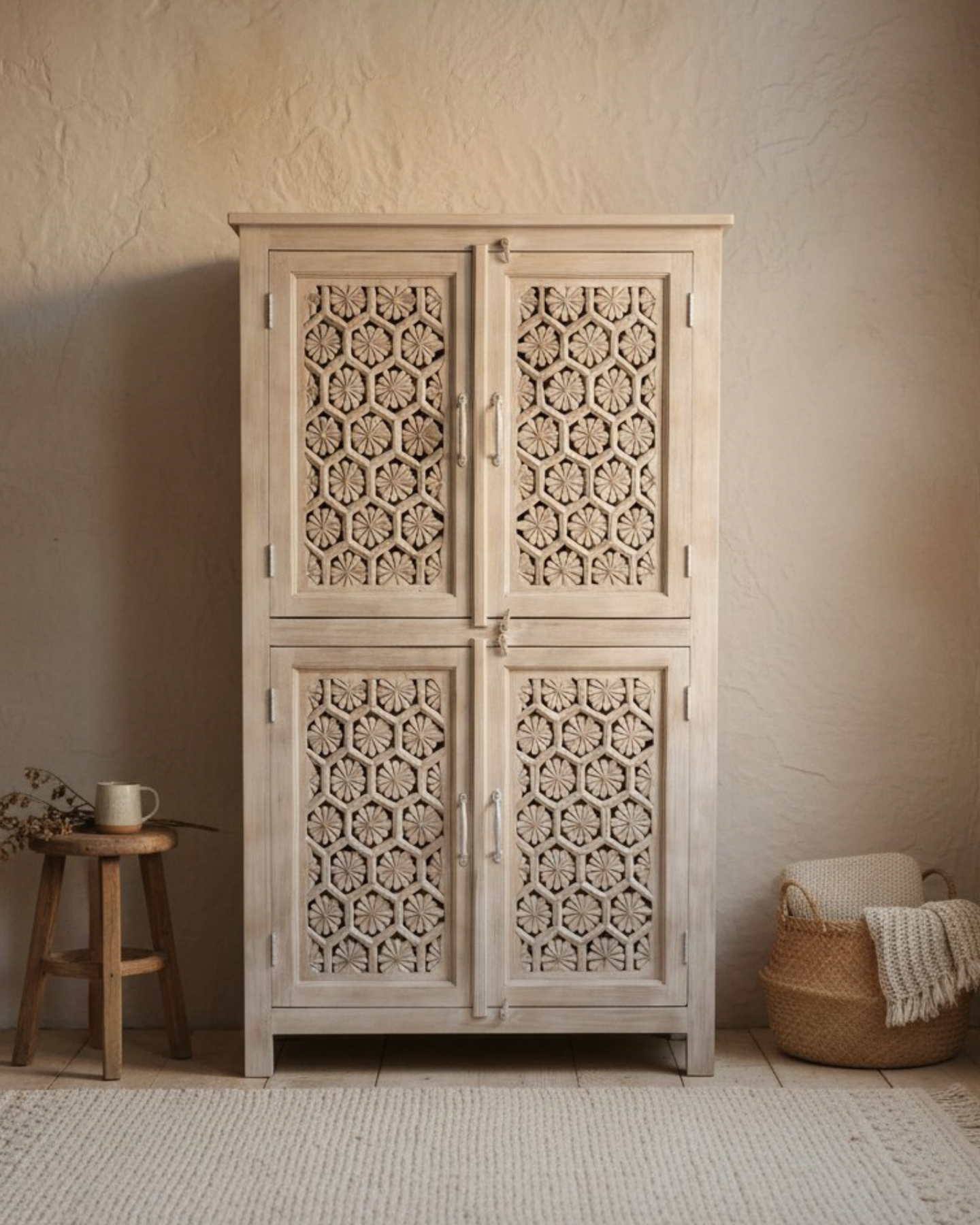 The standout detail is the exquisite Jali-inspired openwork carving, meticulously handcrafted by skilled artisans and arranged across all four doors to create a harmonious, geometric pattern. Behind the doors, a series of spacious internal shelves offer generous storage for linens, pantry goods, tableware or household essentials—making this piece as practical as it is beautiful.