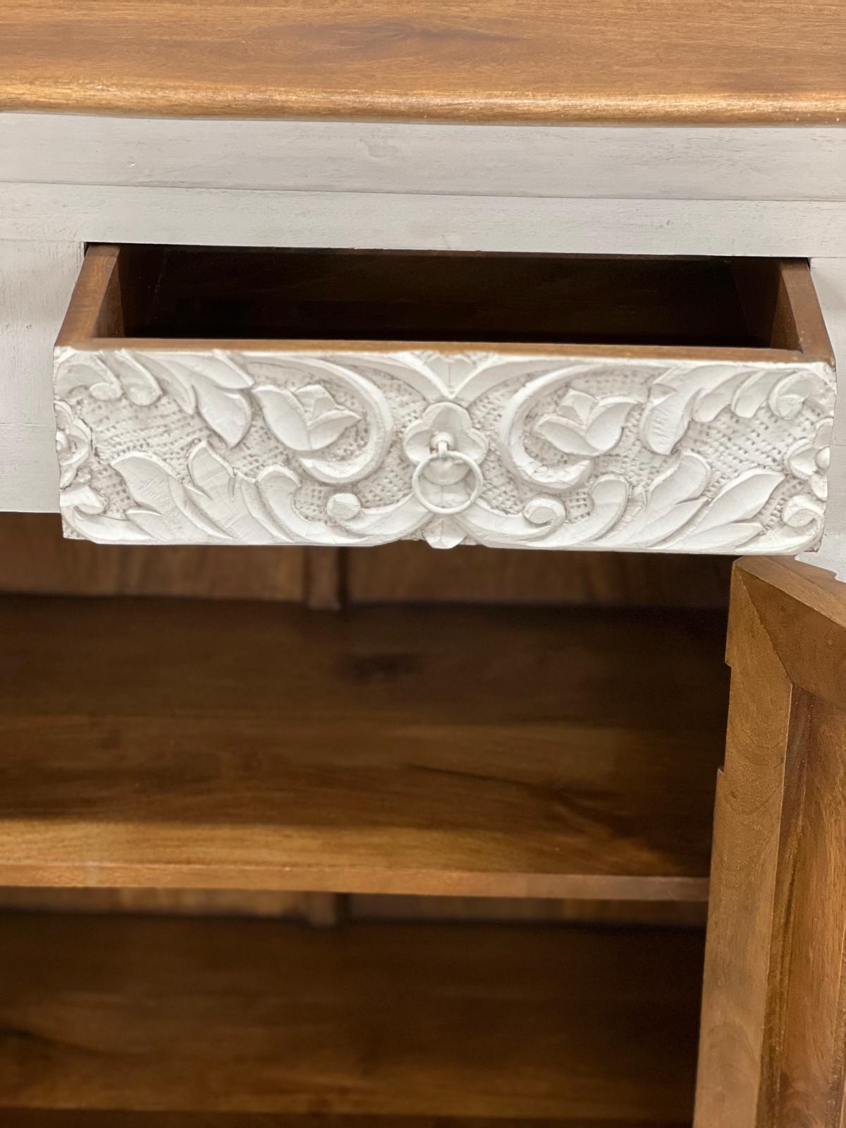 A natural polished mango wood top provides a warm contrast to the painted body, adding richness and balance to the design. Inside, the polished internal space and practical shelving offer generous, well-organised storage, making this piece as functional as it is decorative. Each sideboard carries subtle variations in carving and tone, reflecting its handmade nature and artisanal quality.