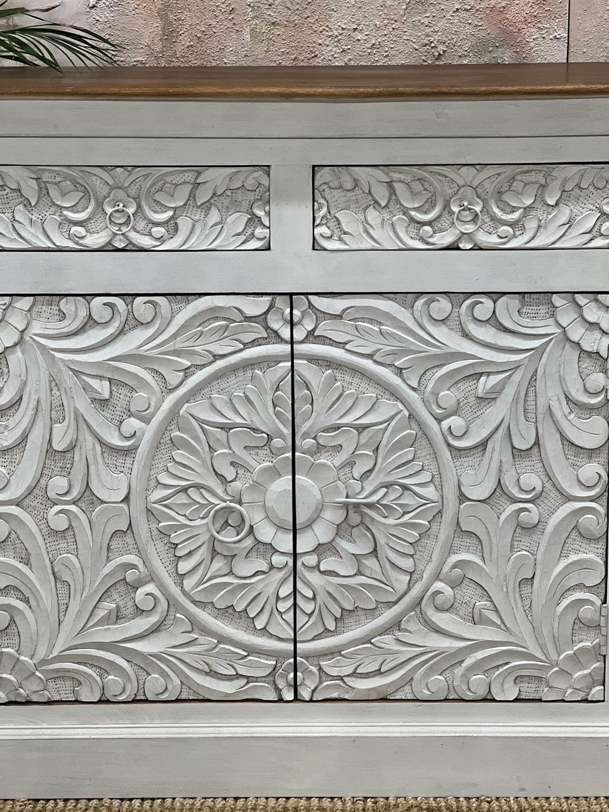 This beautifully detailed sideboard is a striking blend of traditional craftsmanship and considered design. Hand-carved from solid mango wood, the piece features intricate floral motifs across both the drawer fronts and cabinet doors, creating depth, texture, and a strong decorative presence. The whitewashed finish softens the carving, highlighting the detail while keeping the overall look light and refined.