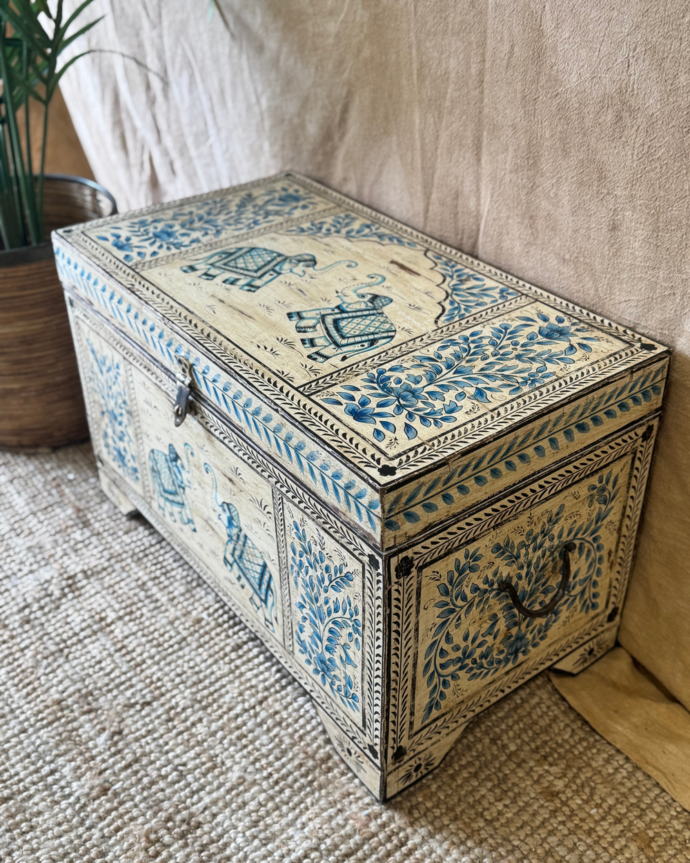 Crafted from solid reclaimed teak, this striking storage chest blends heritage craftsmanship with playful design. The creamy white finish provides a gentle backdrop for hand-painted blue elephants and floral motifs—each brushstroke echoing the artistry of traditional Indian design.