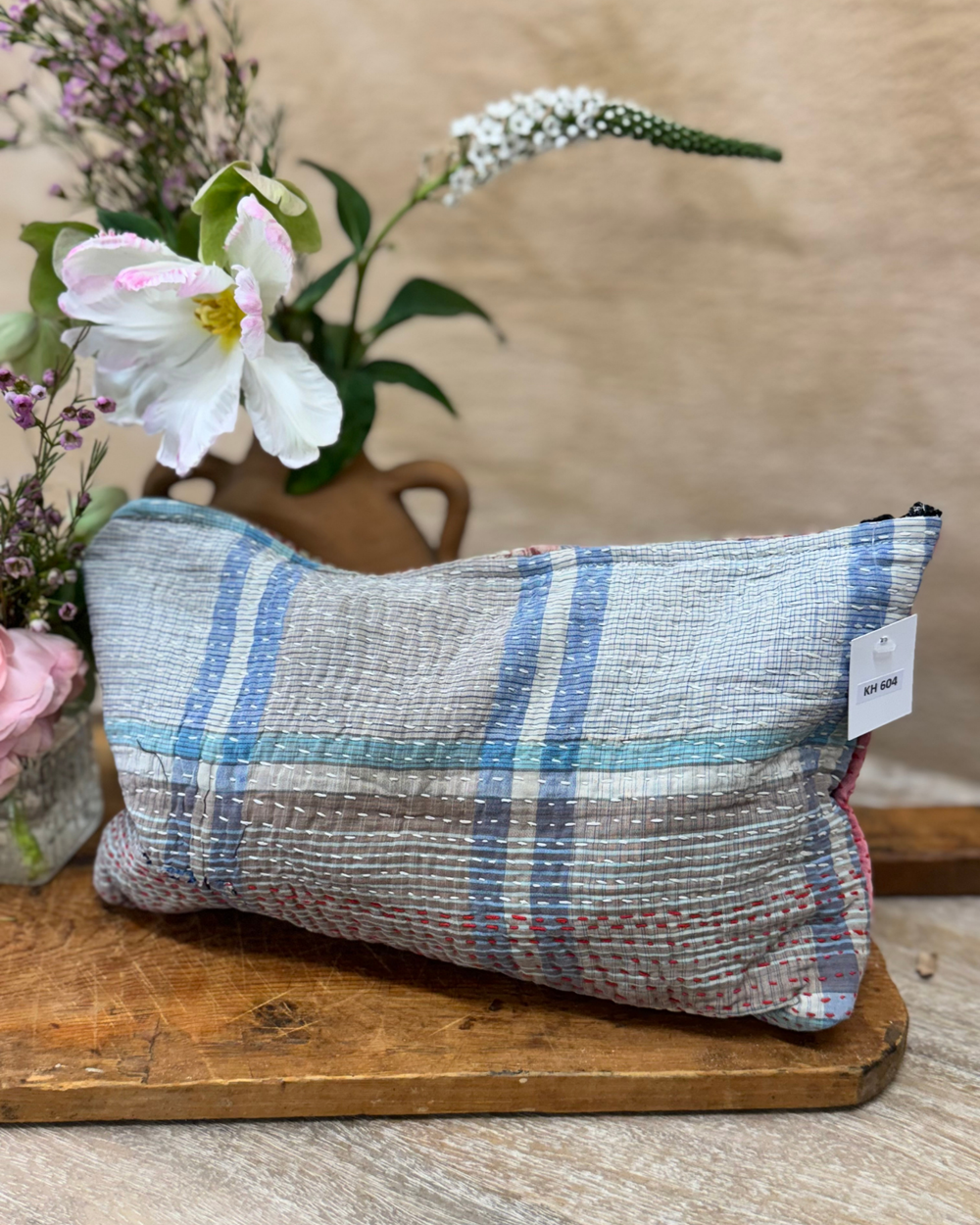 Featuring a subtle blend of dusty rose, sage green, and faded indigo, this large kantha wash bag is adorned with a geometric motif that hints at vintage textile art. Lovingly stitched by hand, it combines beauty with purpose, repurposing cotton fabrics into something both practical and refined. Spacious enough to hold your toiletries or makeup, it’s perfect for the eco-conscious traveller or thoughtful gift-giver.