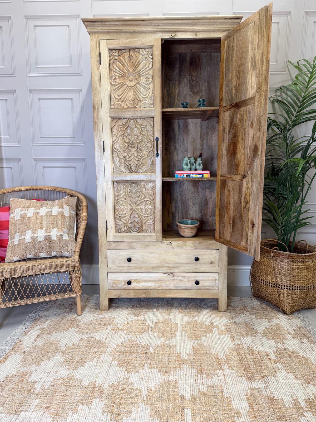 Solid mango wood wardrobe with intricate hand-carved floral panels