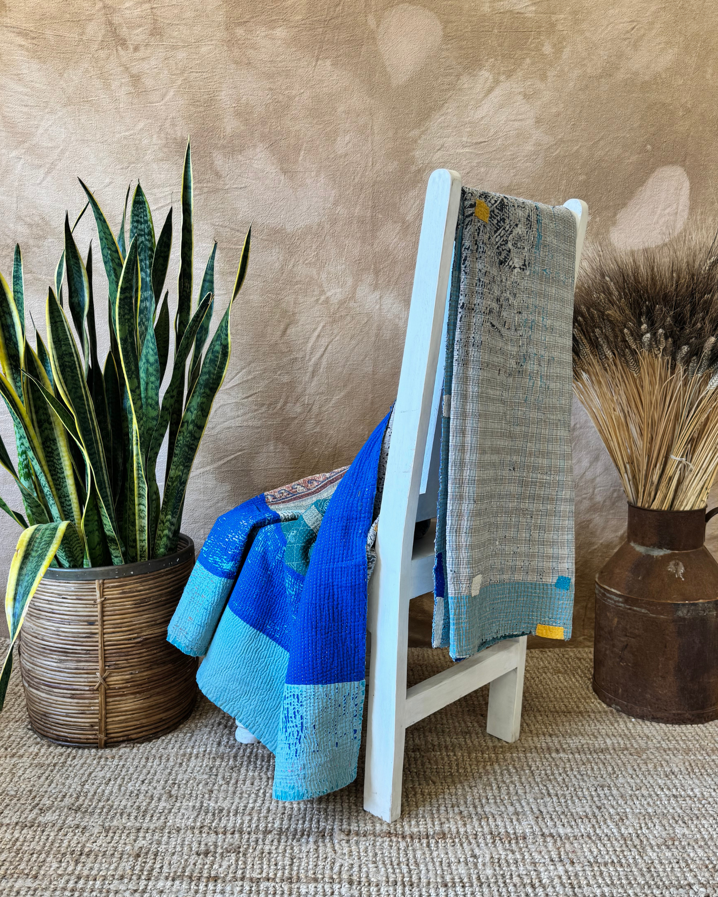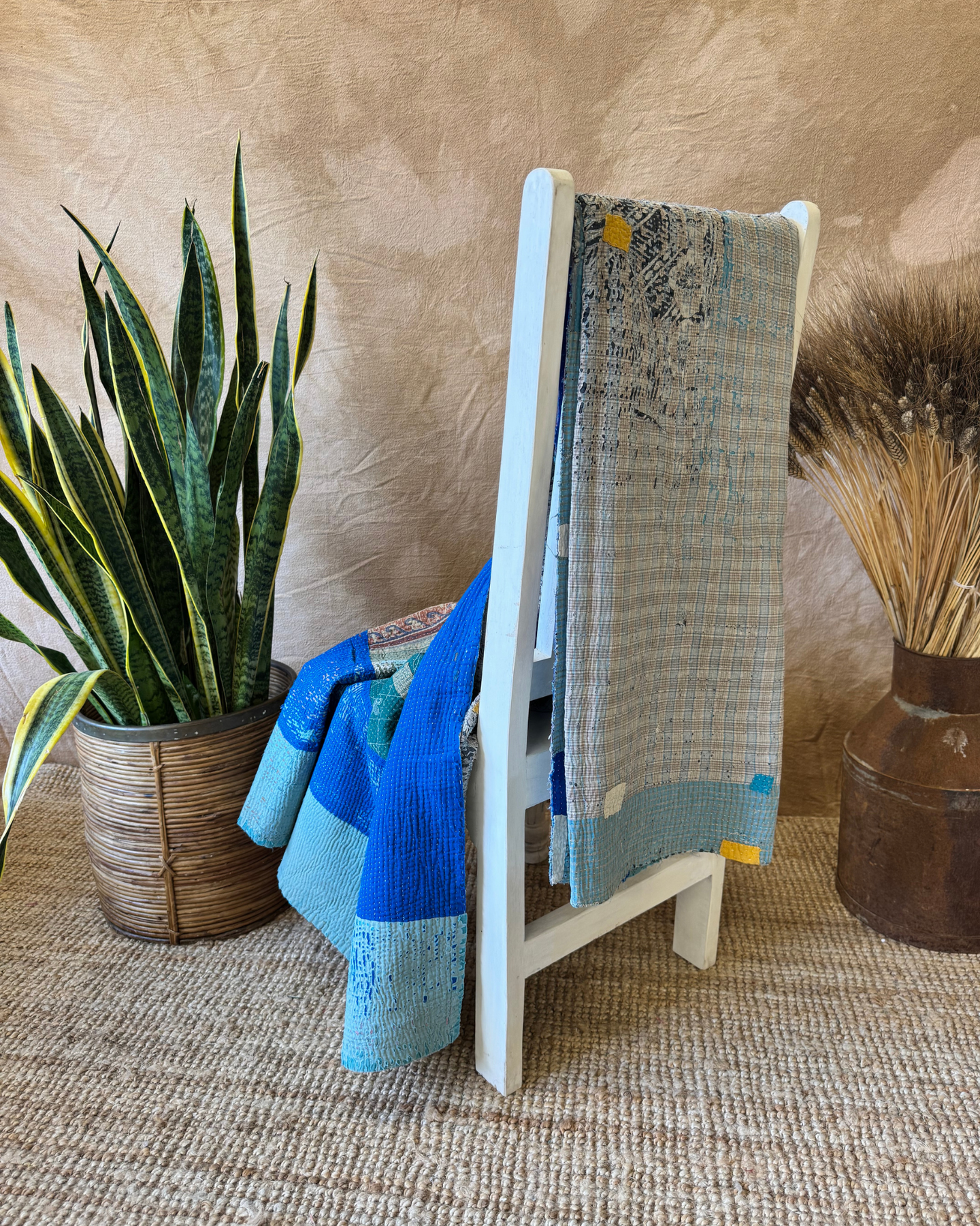 Bold hues of royal blue, teal, rust, and olive with hand Kantha stitching