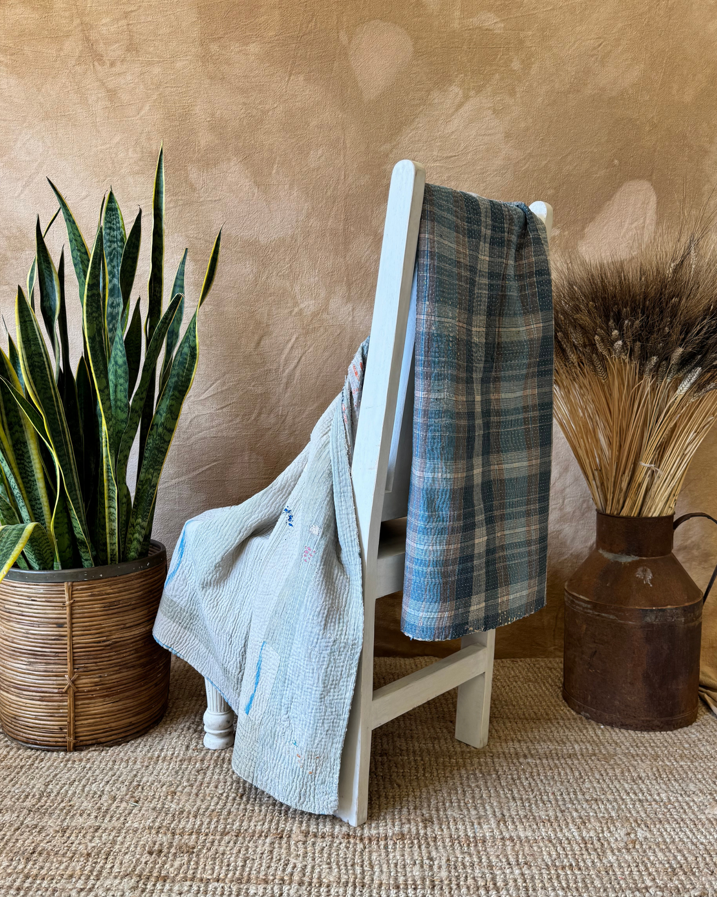 Cool, calm and quietly expressive – this Kantha throw is a beautifully subtle piece, handcrafted from layered vintage sari cloth in faded greys, pale blues and slate tones. The muted palette and refined stitching give it an air of effortless sophistication, perfect for those seeking texture without boldness.